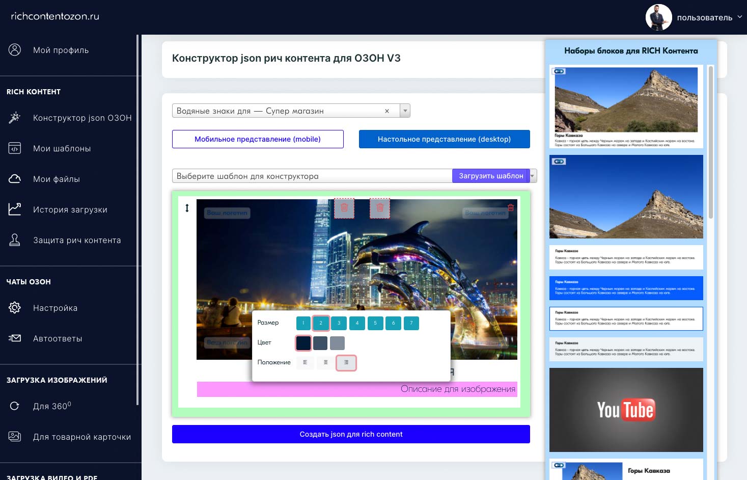 richcontentozon.ru Сервис конструктор для создания rich контент json в ОЗОН. Переместите необходимые блоки в панель для редактирования. Загрузите фото или изображения,